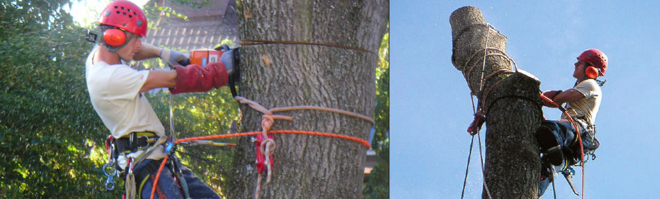 Mit Hilfe der Seilklettertechnik (SKT) sind auch Fällungen auf engstem Raum möglich. Hierbei werden Äste und Stammteile mit speziellen Abseiltechniken sicher zu Boden gelassen. Das Baumumfeld wird somit weitestgehend geschont.